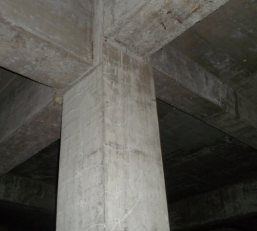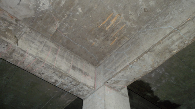 我所技術人員于2013年7月赴現場進行了檢測,檢測結果表明,車庫中心位置上浮位移值最大,上浮后柱底最大高層超過20cm。框架柱在上浮位移產生的附加軸力及附加彎矩的作用下,產生了開裂及壓碎現象(圖3、圖4)??蚣芰憾藗让娌砍霈F了剪切斜裂縫、梁端底部出現水平裂縫(圖5),特別是車庫與高層住宅交界位置,梁端開裂較為明顯。在車庫頂梁板與車庫外周擋土墻交界位置處附加彎矩的作用下,除梁端裂縫外,擋土墻在梁底標高以下位置出現通長水平裂縫。沿車庫平面跨中位置車庫平面縱向,車庫頂板出現兩條通長裂縫;車庫入口處沿車庫平面橫向,車庫頂板同樣出現兩條通長裂縫,頂板裂縫均與上浮位移較大軸線相對應。