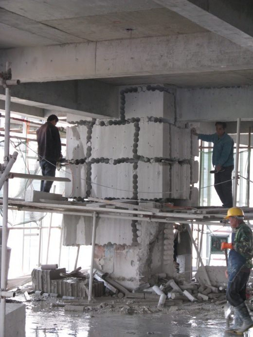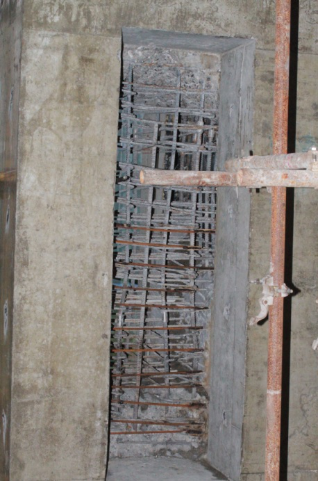 該工程為高層建筑,主樓地下 4層,23層,房屋總高度為:96.900米,框架-核心筒結構,在四層外框架24-F、24-G兩框架柱的混凝土強度極差,通過抱柱梁+小框架形式進行了置換處理,取得了較好的效果。該工程的特點是:荷載大,托換施工不能影響上部樓層的正常施工。