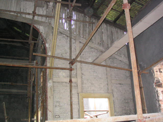 小廣寒影劇院原結(jié)構(gòu)為磚、石、木、鋼混和結(jié)構(gòu)。墻體由亂石、粘土磚用粘土、石灰雜砌而成,中間為鋼柱-鋼梁支撐,屋架為木結(jié)構(gòu),屋面為鐵皮屋面。室內(nèi)頂棚為板條麻刀粘土石灰頂棚,隔墻為木柱、木腰梁半磚隔墻??磁_(tái)為木結(jié)構(gòu)看臺(tái),木樓梯。小廣寒影劇院因年久失修,磚石墻、屋架、看臺(tái)、隔墻等大部分已破損、腐爛。本次修繕工作本著“修舊如舊”的原則,對(duì)建筑物進(jìn)行了針對(duì)性的改造加固