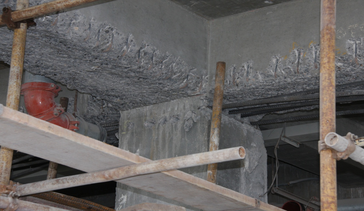 本工程需要進(jìn)行混凝土界面剔鑿的部位:梁加大截面、柱加大截面、新加框架梁。