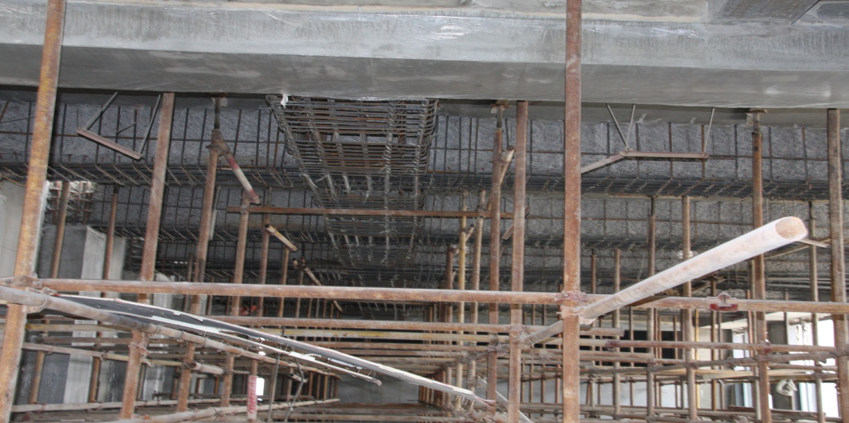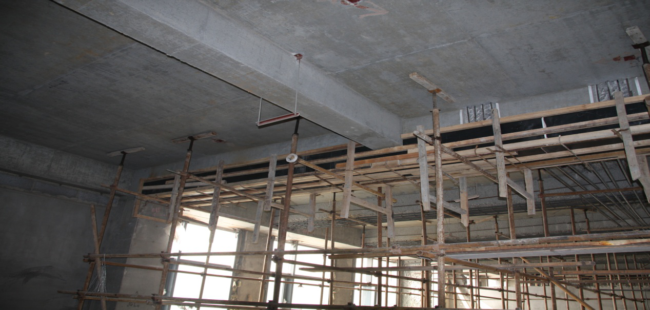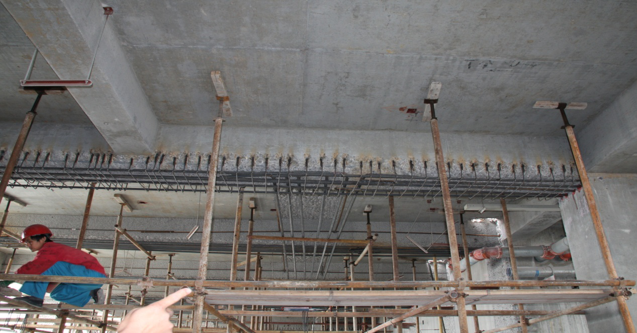 依據(jù)加固設(shè)計(jì)施工圖紙,本工程采用的主要加固施工方法:腳手架支撐卸荷、梁加大截面、柱加大截面、新加框架梁等。主要施工工藝:混凝土界面剔鑿、化學(xué)植筋、特種混凝土澆灌等。特種專業(yè)施工材料:喜利得HILTI HIT-RE 500錨固劑、北京聯(lián)合榮達(dá)RG灌漿料。