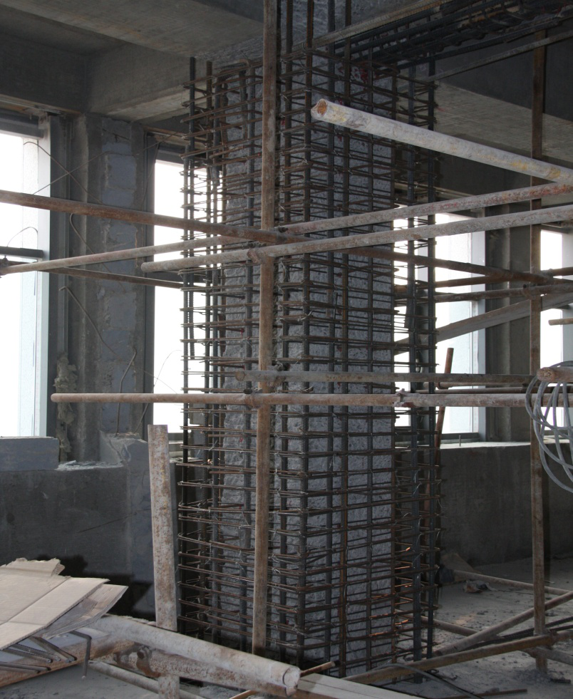 山東大學(xué)綜合科研樓,位于山東大學(xué)中心校區(qū)內(nèi),框架核心筒結(jié)構(gòu),地上27層,地下2層,建筑主屋面高度98.65m,突出屋面塔樓高度為109.75m。因建筑外觀改造要求,需在建筑頂部塔樓位置加建鋼結(jié)構(gòu)鐘樓,我單位負(fù)責(zé)對(duì)原建筑頂部結(jié)構(gòu)進(jìn)行加固施工。