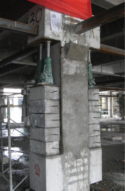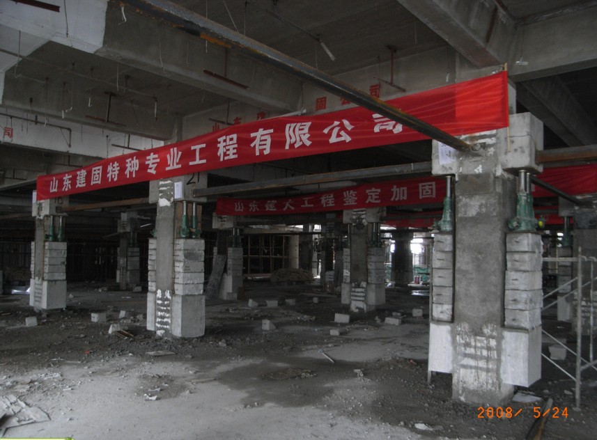 濟寧銀座商場(原華聯(lián)商廈)二期,為四層(局部六層)框架結(jié)構(gòu),建于1992年。原設(shè)計該建筑物的四層和五層層高為2.9m,現(xiàn)已不能滿足使用要求,每層需整體抬升1.1m