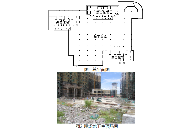 海南某住宅小區(qū),由3棟高層住宅及住宅中間的單層地下車庫(kù)組成(圖1、圖2)。三座高層住宅為剪力墻結(jié)構(gòu),筏板基礎(chǔ);地下車庫(kù)為框架結(jié)構(gòu),柱下獨(dú)立基礎(chǔ)結(jié)合防水底板,防水底板為梁板式結(jié)構(gòu),防水底板與高層筏板間設(shè)后澆帶。