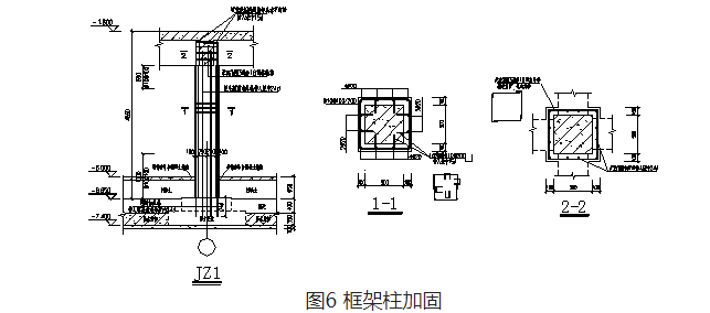 現(xiàn)場(chǎng)檢測(cè)發(fā)現(xiàn),車庫(kù)上浮導(dǎo)致柱開(kāi)裂且絕大部分柱產(chǎn)生了受壓區(qū)混凝土壓碎現(xiàn)象,柱發(fā)生受壓破壞,故采用加大截面方法對(duì)車庫(kù)內(nèi)55棵框架柱進(jìn)行加固。原柱每邊外擴(kuò)10cm,增設(shè)豎向鋼筋及箍筋,采用高強(qiáng)免振搗灌漿料澆筑,見(jiàn)圖6。