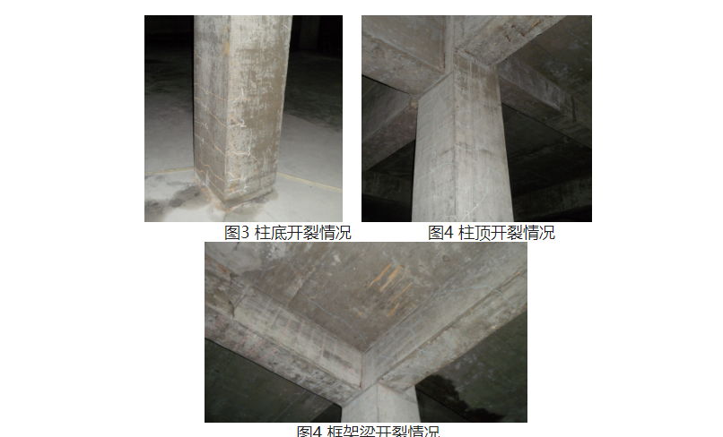 我院技術(shù)人員于2013年7月赴現(xiàn)場(chǎng)進(jìn)行了檢測(cè),檢測(cè)結(jié)果表明,車庫(kù)中心位置上浮位移值最大,上浮后柱底最大高層超過(guò)20cm??蚣苤谏细∥灰飘a(chǎn)生的附加軸力及附加彎矩的作用下,產(chǎn)生了開(kāi)裂及壓碎現(xiàn)象(圖3、圖4)。框架梁端側(cè)面部出現(xiàn)了剪切斜裂縫、梁端底部出現(xiàn)水平裂縫(圖5),特別是車庫(kù)與高層住宅交界位置,梁端開(kāi)裂較為明顯。在車庫(kù)頂梁板與車庫(kù)外周擋土墻交界位置處附加彎矩的作用下,除梁端裂縫外,擋土墻在梁底標(biāo)高以下位置出現(xiàn)通長(zhǎng)水平裂縫。沿車庫(kù)平面跨中位置車庫(kù)平面縱向,車庫(kù)頂板出現(xiàn)兩條通長(zhǎng)裂縫;車庫(kù)入口處沿車庫(kù)平面橫向,車庫(kù)頂板同樣出現(xiàn)兩條通長(zhǎng)裂縫,頂板裂縫均與上浮位移較大軸線相對(duì)應(yīng)。