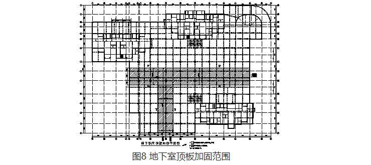 車庫(kù)頂板東西向存在兩條通長(zhǎng)大裂縫,南北向也有兩條較長(zhǎng)裂縫。將裂縫區(qū)域的板加厚10cm,即在板頂增設(shè)10cm鋼筋混凝土層,對(duì)板進(jìn)行加固,同時(shí)提高梁端截面的承載力,加固范圍見(jiàn)圖8。對(duì)底部開(kāi)裂的板,灌縫后采用粘貼碳纖維方法進(jìn)行加固。