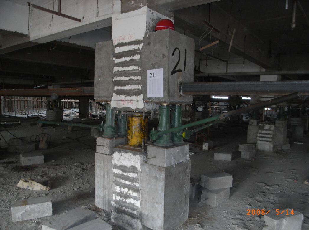 濟(jì)寧銀座購物廣場(原濟(jì)寧華聯(lián)商廈)二期工程,為五層(局部六層)框架結(jié)構(gòu),建于1992年。該建筑物的四層和五層原設(shè)計(jì)為倉庫用房,層高為2.9m,面積共計(jì)約2500㎡,現(xiàn)業(yè)主單位決定將四層和五層改造成商場經(jīng)營空間,層高不滿足使用要求,委托我公司對四層、五層進(jìn)行加高改造處理。本著建設(shè)節(jié)約型社會、打造精品工程的宗旨,我公司與業(yè)主方研究決定采用整體頂升技術(shù)對四層、五層進(jìn)行抬升改造,每層抬高1.25m。該工程于2008年4月5日開工,2008年6月15日完工。